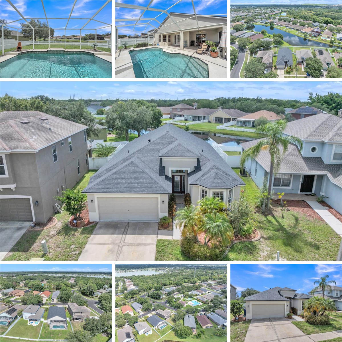 WELCOME TO THE SUNSET HOUSE - Private SUBURBAN community of Amberly in Parkway Center! This beautifully maintained OPEN FLOORPLAN 3-bedroom, 2-bathroom pool home with a 2-car garage offers 1,741 sq ft of living space and is perfectly positioned on a tranquil pond for breathtaking sunsets from the pool Lanai. Built in 2001 with full CONCRETE BLOCK construction, the residence features SOARING 12 FOOT CEILINGS, a desirable split floor plan, and an inviting living area with BRAZILIAN HARDWOOD FLOORING and insulated glass doors that open to the screened, Sparkling HUGE SCREENED POOL LANAI AND DEEP POOL WITH SCREENED ENCLOSURE. The master suite includes a WALK-IN CLOSET, dual sinks, a garden tub, a glass-enclosed shower, and SLIDING GLASS DOORS OVERLOOKING THE POOL AND WATER. Outdoors, the birdcage-enclosed pool area is complemented by a spacious covered seating area and a FULLY FENCED BACK YARD with white PVC fencing and lush landscaping. A custom screened pool security fence is included! Recent upgrades include a 2025 BRAND-NEW ROOF with premium black charcoal shingles and black drip edge installed by Storm Safe Roofing & Exteriors, a 2022 YORK HVAC system, a 2018 Rheem water heater, and a 50-AMP home generator plug-in. The three-speed self-cleaning pool pump with jets keeps the pool sparkling, while the home’s low HOA of $320/year and low CDD of $1,226/year add to its appeal. COMMUNITY AMENITIES ARE ONE STREET TO THE SOUTH and include a refreshing community pool, a welcoming clubhouse, tennis courts, a playground, and a scenic park — all within a neighborhood where the roads have been freshly paved. This property offers the perfect blend of comfort, style, and Florida living in a peaceful, well-kept setting.*Free 1% rate buy down through use of preferred lender*